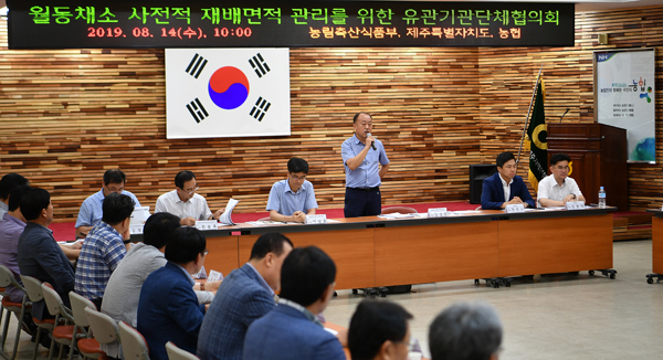 농림축산식품부는 14일 오전 농협제주지역본부 4층 대회의실에서 한림·한경·고산·김녕·애월·구좌·대정·안덕·표선·성산일출봉농협조합장과 월동무·양배추·마늘·양파 품목단체생산자협의회장, 독농가, 제주도청 관계자, 유관기관 등 40여명이 참석한 가운데 '월동채소 사전적 재배면적 관리를 위한 유관기관단체협의회'를 개최했다.
