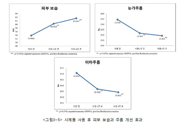 3D 피부 촬영장치 측정 결과에서도 눈가 주름은 6.5%, 이마 주름은 10%가량 줄어든 것으로 나타났다. 각질 세포 대상 연구에서 1% 풋귤 추출물을 처리한 결과 주름과 탄성에 영향을 주는 히알루론산은 40%, 각질 세포 간 단단한 결합으로 피부를 촉촉하게 하는 필라그린은 18% 증가했다.