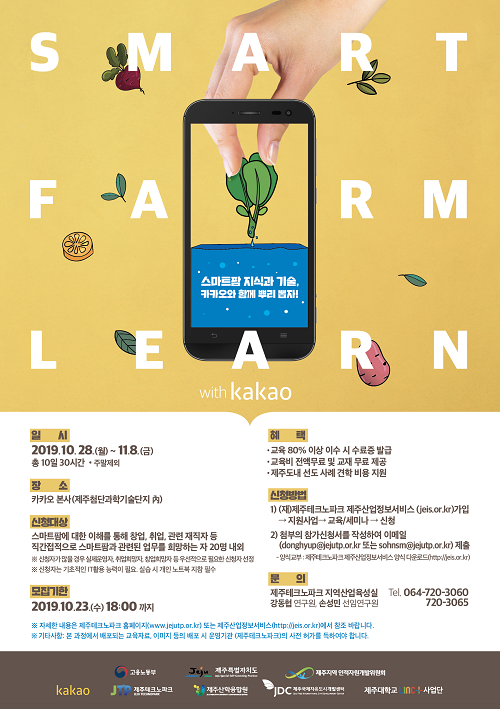 제주TP는 포털서비스 카카오와 함께 스마트팜에 대한 이해와 기술교육으로 제주지역 스마트팜을 확산시켜 나가기 위해 오는 28일부터 다음달 8일까지 '스마트팜 러닝(Learning)' 과정을 제주첨단과학기술단지 내 카카오 본사에서 운영한다고 11일 밝혔다.