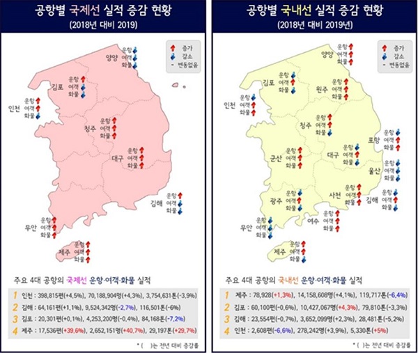 국내선 여객의 경우 내·외국인의 제주여행 수요가 증가하는 등 제주와 내륙노선 여객이 증가함에 따라 2018년 대비 증가했다.