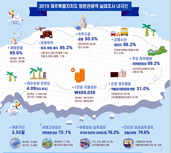 제주관광공사는 7일 '2019년 제주도 방문관광객 실태조사' 결과를 발표했다. 해당 조사는2014년 국가승인통계 인정을 받았다. 지난 한 해 동안 제주국제공항 등 주요 관문에서 제주도를 방문하는 만 15세 이상 총 1만2000명을 대상으로 이뤄졌다.