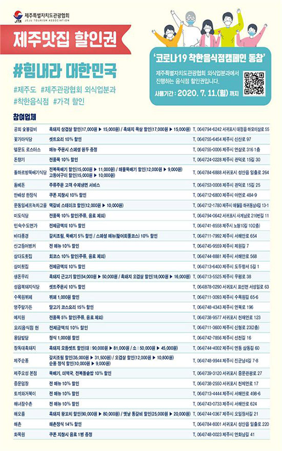 코로나19 위기를 함께 극복해내자는 취지로 관광객·도민들의 외식 가격부담을 낮추기 위해 도내 30개 음식점들이 자발적으로 참여했다.
