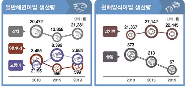 주요 품종인 갈치와 고등어 생산량이 각각 809t(4.0%), 789t(35.9%)으로 늘어난 반면 우뭇가사리는 2856t 감소(-82.7%)했다. 양식어업의 대부분을 차지하는 넙치도 10년 사이 1078t(5.0%) 생산량이 늘었다.