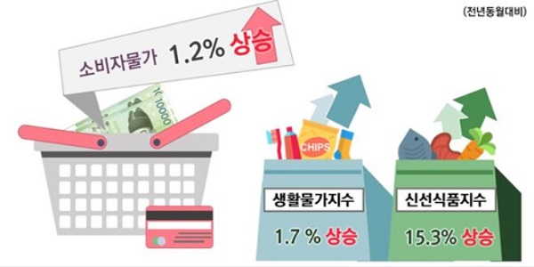 전월대비 등락품목을 보면 유가 상승 영향으로 휘발유(4.2%), 경유(5.2%), 자동차용LPG(6.0%) 등 연료값이 올랐고 가공식품중에서는 비스킷(4.0%), 아이스크림(2.0%) 등이 올랐다.