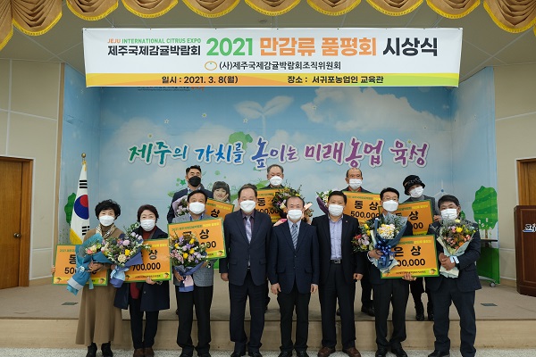 ㈔제주감귤박람회조직위원회(조직위원장 양병식)는 지난 8일 서귀포농업기술센터 농업인교육관에서 '2021 제주국제감귤박람회 만감류 품평회 시상식'을 열고 레드향, 한라봉, 천혜향 등 3개 품목의 수상자들에게 상패와 시상금을 전달했다고 9일 밝혔다.