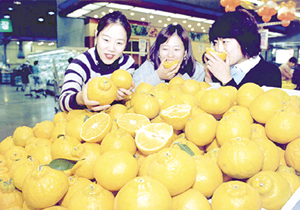 제주명물 ‘한라봉’이 5일 서울소재 농협 하나로클럽 양재점에 첫 출하됐다. 농협 하나로클럽 양재점에 따르면 첫 출하된 한라봉의 판매가는 6개들이 1상자(3㎏)당 4만8000원, 8개들이 4만3000원, 10개들이 3만3000원으로 지난해 평균 3만5000원보다 높은 수준이다.
