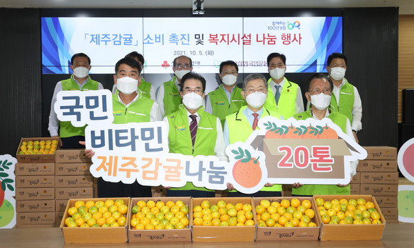 5일 농협중앙회 본관에서 열린 '제주 하우스감귤 나눔행사'에서는 하우스감귤 농가를 돕고 코로나19로 지친 사회복지시설 종사자에게 응원과 감사의 메시지를 전하기 위해 사회복지공동모금회를 통해 전국 500개 사회복지시설에 제주 하우스감귤을 전달하는 행사를 가졌다.