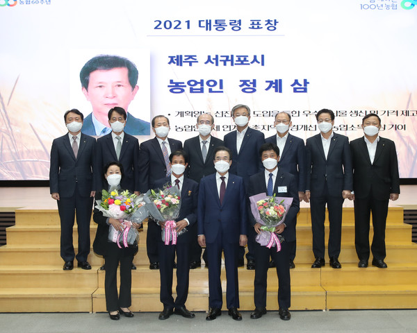제주농협(본부장 강승표)은 21일 농협중앙회 창립 60주년 기념 표창 전수식에서 남원농협(조합장 김문일) 조합원인 정계삼(69)·한정숙(66) 부부가 '제56회 새농민상(像) 본상' 및 대통령표창을 수상했다고 밝혔다.