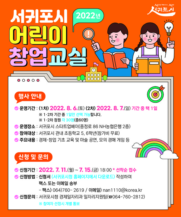 서귀포시는 지역내 초등학교 5·6학년 60명을 대상으로 경제와 창업에 대한 실전 체험 학습의 기회를 주는 ‘2022년 서귀포시 어린이 창업교실’을 운영한다.