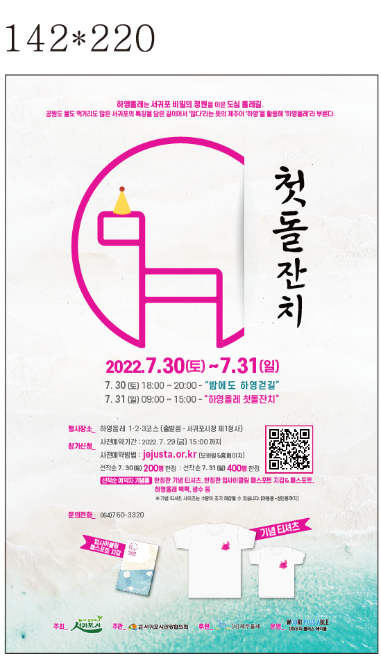 ‘첫 돌’을 기념한 선물도 풍성하다. 사전 참가 신청을 한 600명에게는 하영올레 로고가 새겨진 티셔츠와 한정판 하영올레 스탬프북, 여권케이스, 하영올레 백팩을 준다. 서귀포시 공보실은 SNS 이벤트를 통한 경품행사를 진행한다.