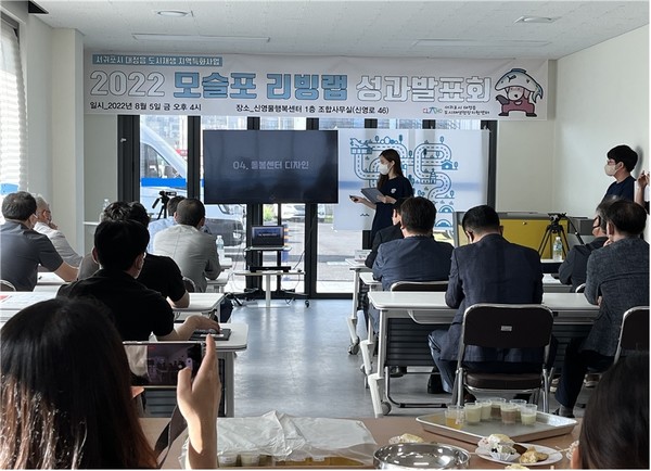 서귀포시 대정읍도시재생현장지원센터(이하 센터)는 최근 사업에 참가한 2개 대학교와 대정읍의 특산품과 다양한 자원을 활용한 공간 디자인과 지역특화 레시피를 개발하는 ‘2022 모슬포 리빙랩’성과보고회를 열었다.