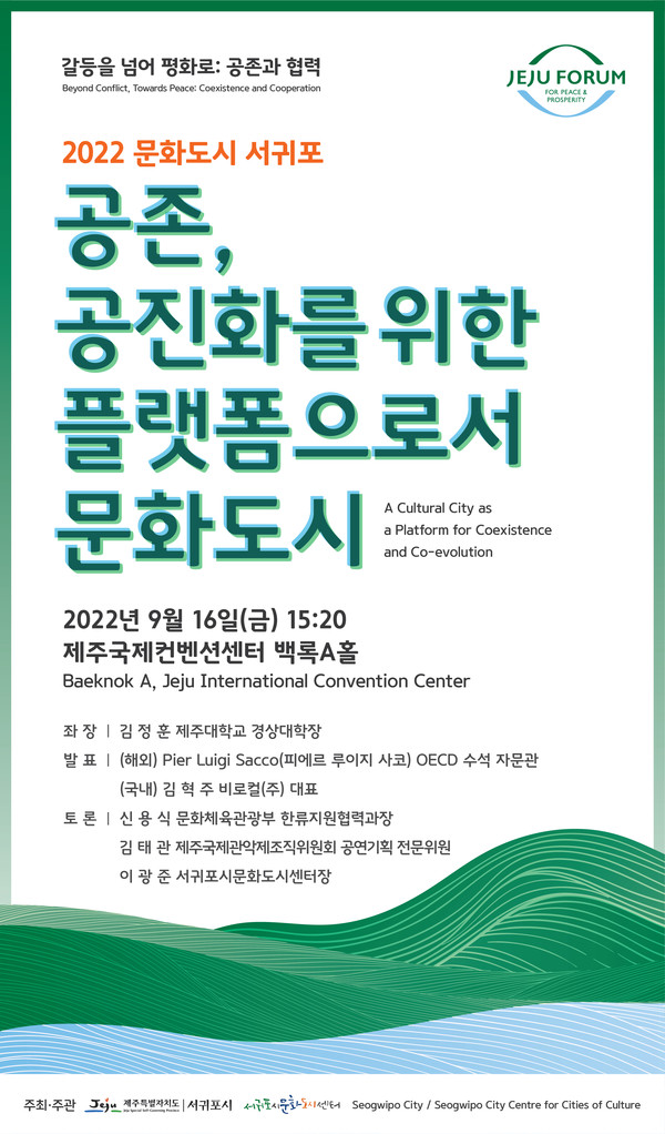 오는 14~16일 '갈등을 넘어 평화로: 공존과 협력'을 대주제로 제주국제컨벤션센터(ICC JEJU)서 진행하는 제17회 평화와 번영을 위한 제주포럼에 ‘서귀포시 문화도시 세션’이 꾸려진다.