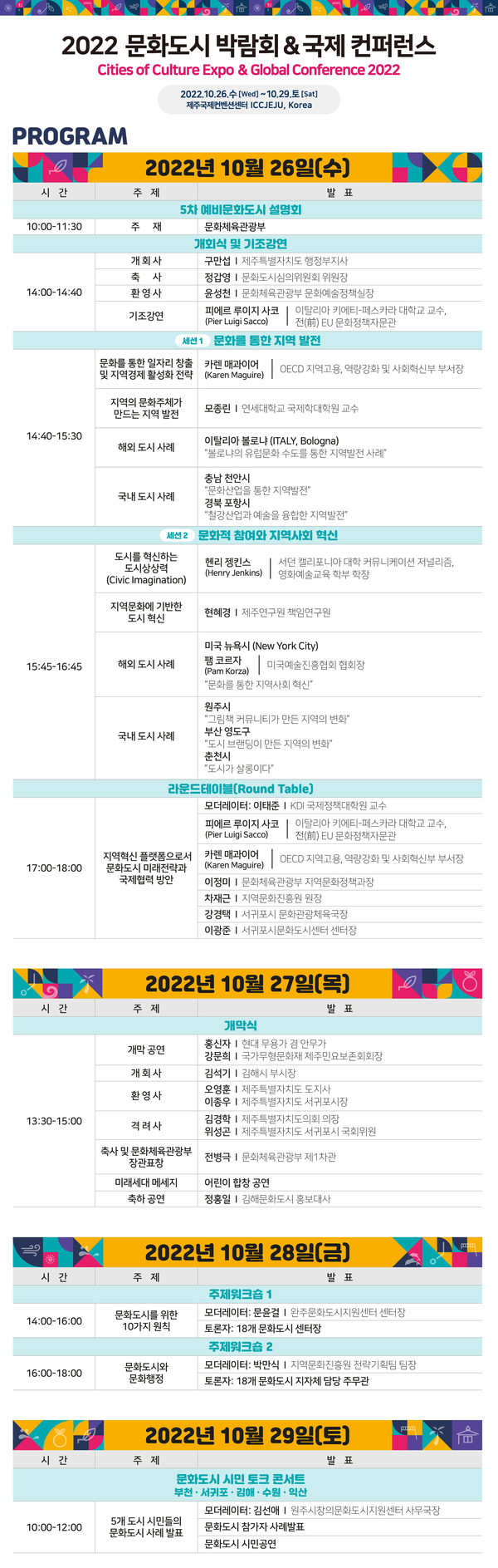 첫날인 26일에는 ‘문화로 지역혁신, 문화도시 미래전략과 국제협력’주제의 문화도시 국제컨퍼런스가 열린다. 이탈리아 키에티-페스카라 대학교 경제학과 피에르 루이지 사코 교수가 ‘문화와 지역발전’을 주제로 기조 강연한다.
