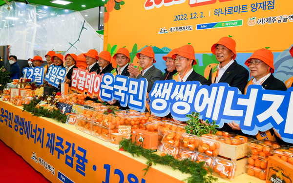 제주도와 농협중앙회 제주지역본부(본부장 강승표), ㈔제주감귤연합회(회장 김문일)는 1일 서울 서초구 하나로마트 양재점에서 2022년 감귤데이 기념행사를 개최했다.