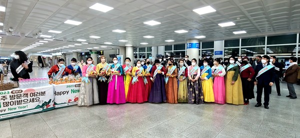 ㈔제주국제감귤박람회조직위원회(위원장 양병식)는 새해 첫날 제주공항에서 제주감귤 시니어 홍보대사 '제주 감귤삼춘' 24명과 함께 제주도를 찾은 관광객들을 대상으로 2023개의 감귤을 나누고 제주관광, 고향사랑기부제를 홍보하는 행사를 실시했다.