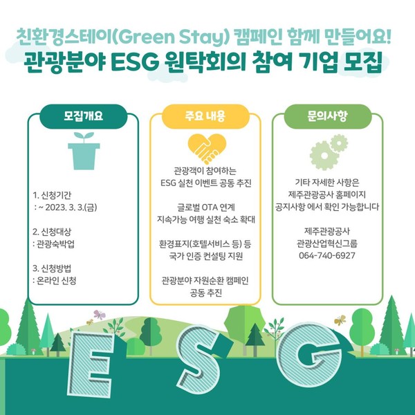 제주관광공사는 관광분야 자원순환 선도를 위한 ESG 원탁회의 참여 기업을 다음달 3일까지 모집한다고 20일 밝혔다.