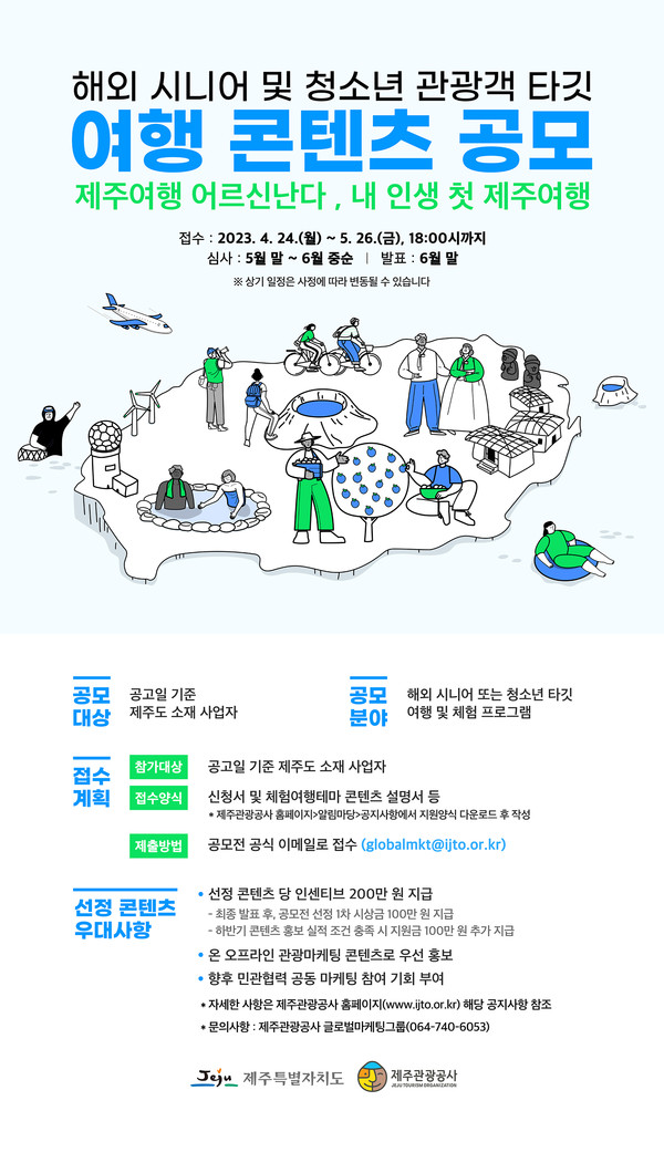제주도와 제주관광공사는 다음달 26일까지 '해외 시니어 및 청소년 관광객 타깃 여행 콘텐츠 공모전'을 온라인 접수한다고 24일 밝혔다.