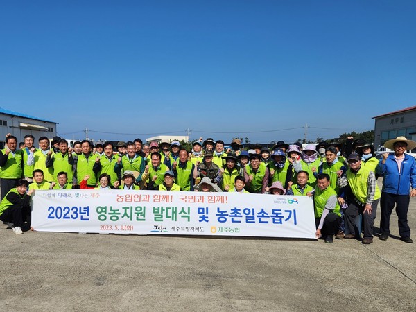 제주도(도지사 오영훈)와 농협중앙회 제주본부(본부장 윤재춘)는 9일 대정농협유통센터에서 농촌일손돕기의 시작을 알리는 '영농지원 발대식'을 개최했다.