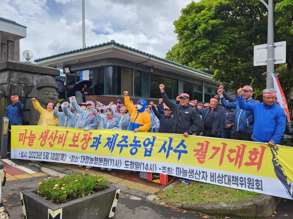대정읍 지역 농민 등으로 구성된 마늘생산자 비상대책위원회는 18일 대정농협과 제주도청 앞에서 '마늘 생산비 보장과 제주농업 사수 궐기대회'를 개최했다.