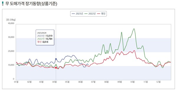 반면 월동무의 12월~익년 6월 전국 평균 도매가격(상품 20㎏)은 2018년산 8294원, 2019년산 1만5113원, 2020년산 1만807원, 2021년산 1만2537원, 2022년산 1만5765원 등에 머무는 등 낮은 시세가 굳어지고 있다.