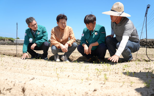이에 오영훈 제주도지사는 이날 구좌읍 당근 농지 가뭄현장을 방문해 상황을 점검하고 지원방안을 모색했다.