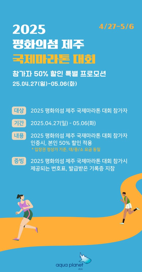 아쿠아 플라넷 제주가 4월 27일부터 5월 6일까지 제민일보 ‘2025평화의섬 제주 국제마라톤 대회’ 참가자를 대상으로 입장권 50% 할인 혜택을 제공하는 특별 프로모션을 진행한다.