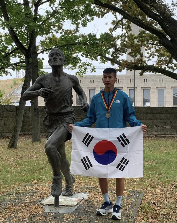 션은 지난 21일 제5의 메이저 마라톤 대회인 베를린 마라톤을 성공적으로 완주한 후, 23일 베를린 올림픽 스타디움 인근에 위치한 손기정 선생님의 동상 앞을 찾았다고 전했다. 공개된 사진 속에서 그는 동상 옆에 서서 자랑스럽게 태극기를 흔들며 감동적인 순간을 기록했다.