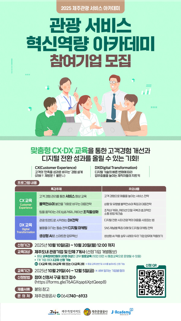 제주도와 제주관광공사(사장 고승철)가 도내 관광기업 및 단체를 대상으로 관광 서비스 혁신역량 아카데미 참가자를 모집하고 있다.